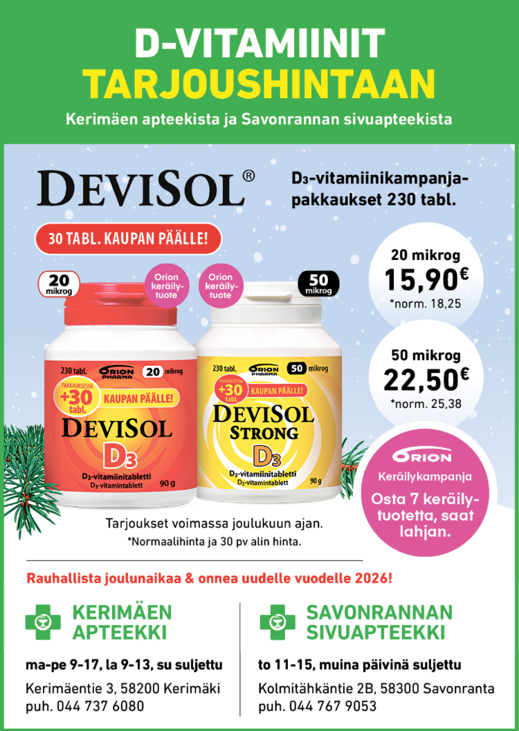 Kerimäentie 3 58200 Kerimäki ma–pe 9–17, la 9–13 puh. 044 737 6080, 044 737 6081