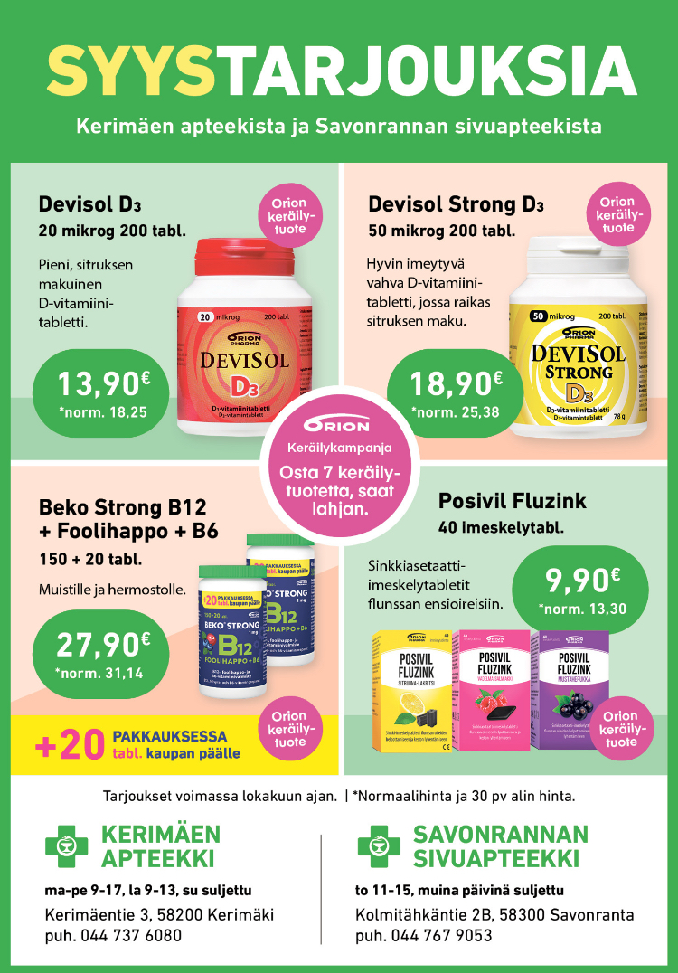 Kerimäentie 3 58200 Kerimäki ma–pe 9–17, la 9–13 puh. 044 737 6080, 044 737 6081